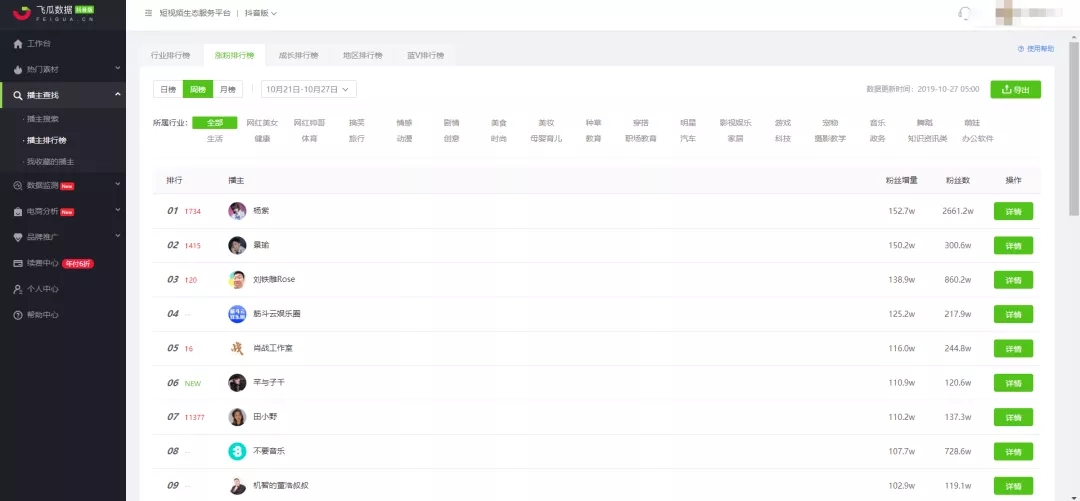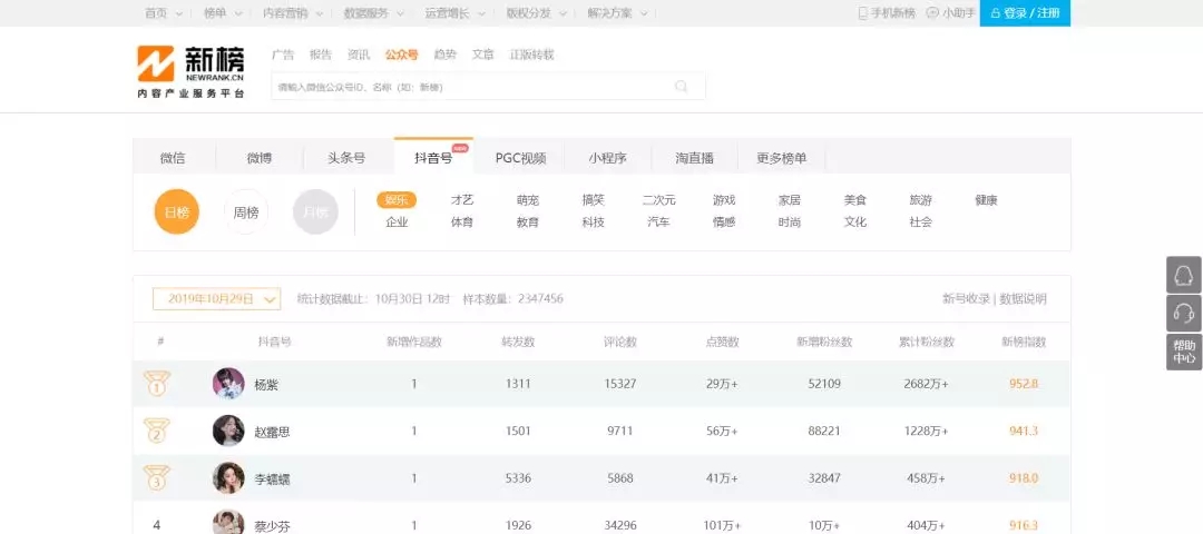 做公众号数据监测的新榜,也有个抖音号板块。不过数据维度少,功能单一。仅仅只是展示抖音号的数据。