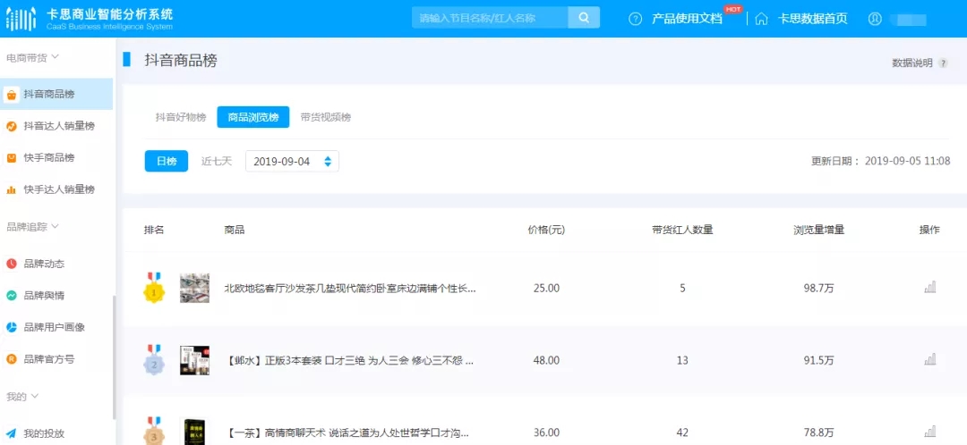 此外,卡思数据的其他功能与飞瓜数据相似。但卡思数据涵盖的平台广泛,包括:抖音、快手、B站、微博视频、西瓜视频、火山小视频、美拍视频和秒拍视频等。不过在电商分析模块,仅监测快手和抖音的数据。针对中小用户使用上,飞瓜数据的优势更为明显。我们仍以抖音商品分析为例:卡思数据:可以查看日榜、周榜或自定义事件的商品榜单。主要榜单是抖音好物榜、商品浏览榜和带货视频榜。主要是数据,是商品价格和浏览带货数据。也可以查看带货视频和带货红人的数据。