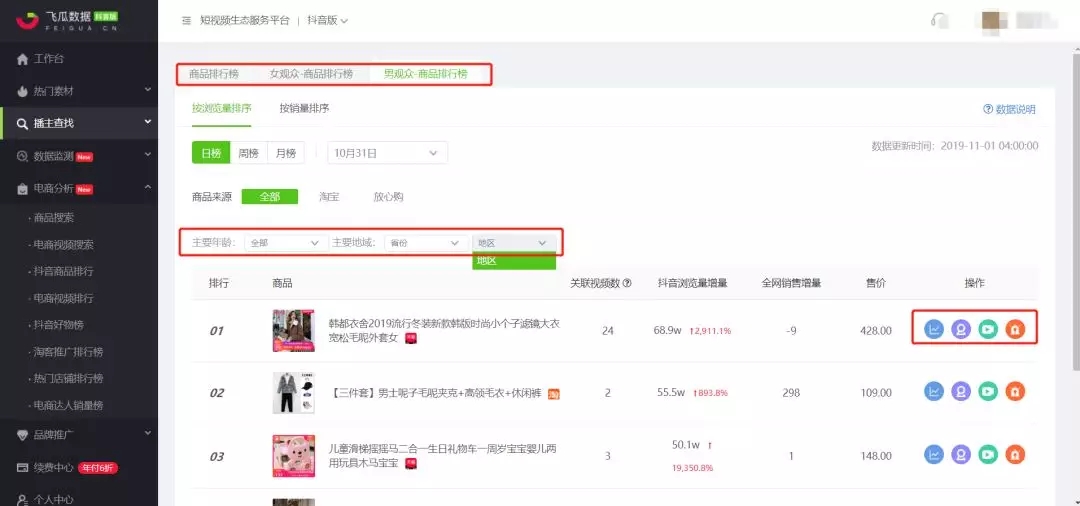 飞瓜数据在榜单设置上维度更多,可以按用户性别、年龄和地区查看。除了日榜、周榜外还有月榜数据。其中,比较实用的是每个热销商品后面的:热度分析、在售播主分析、推广视频分析和商品舆情分析。协助深度分析爆款商品特性和发展走势,提供更多的数据参考维度。
