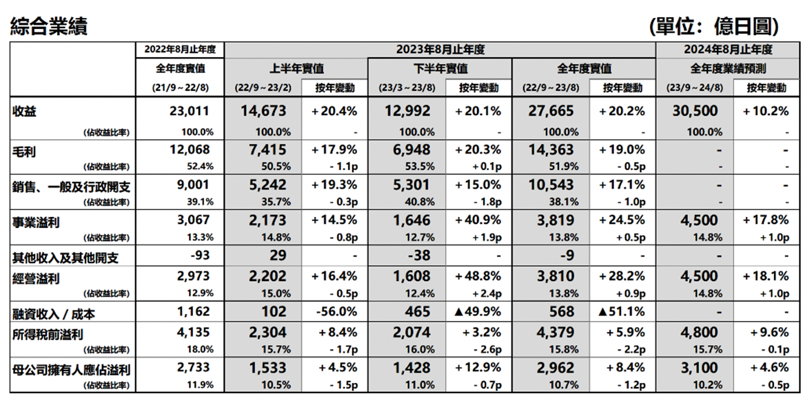 我们先来看一下优衣库所属集团,迅销集团整体财务情况。截止到2023年的财报,他们综合收益同比上涨20.2%,综合经营溢利上涨28.2%。用人话说就是,不仅仅整体GMV在涨,他的净利润也在涨。也就是说,优衣库不仅仅卖的多,而且成本控制的非常好,赚得也很多。