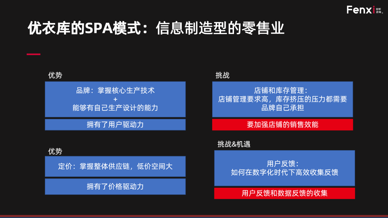优衣库在2000年就开始改革施行SPA模式。SPA模式指的是从商品的策划、制造到销售都整合在一起管理的模式。说人话就是,高度集中的自产自销。