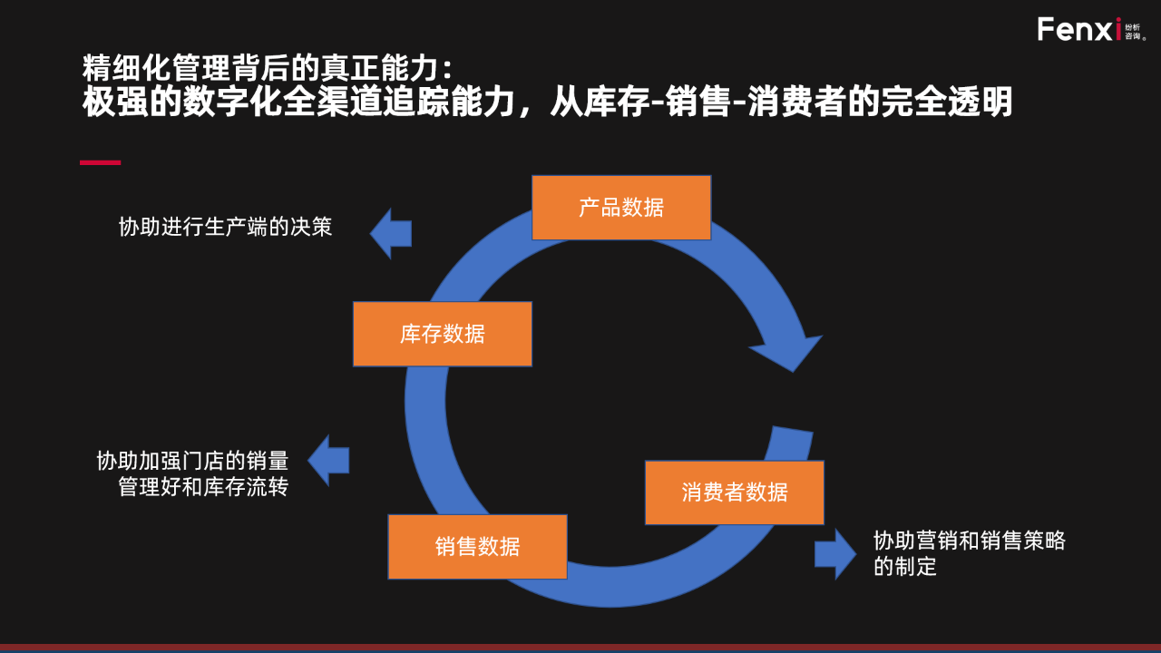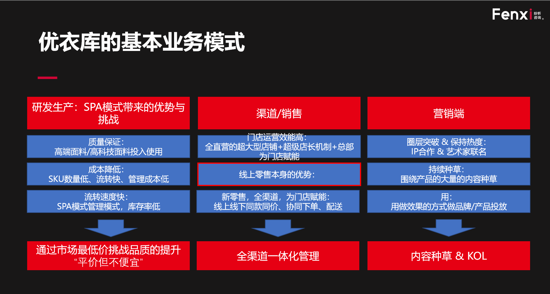 因此,优衣库的第二个内功,就是渠道的数字化管理。正因为他们自营门店和所有渠道的转化能力极强,他们可以放心大胆地做少SKU但是大库存的模式,因为拥有通过我的门店或者渠道都可以卖掉和快速流转的自信。