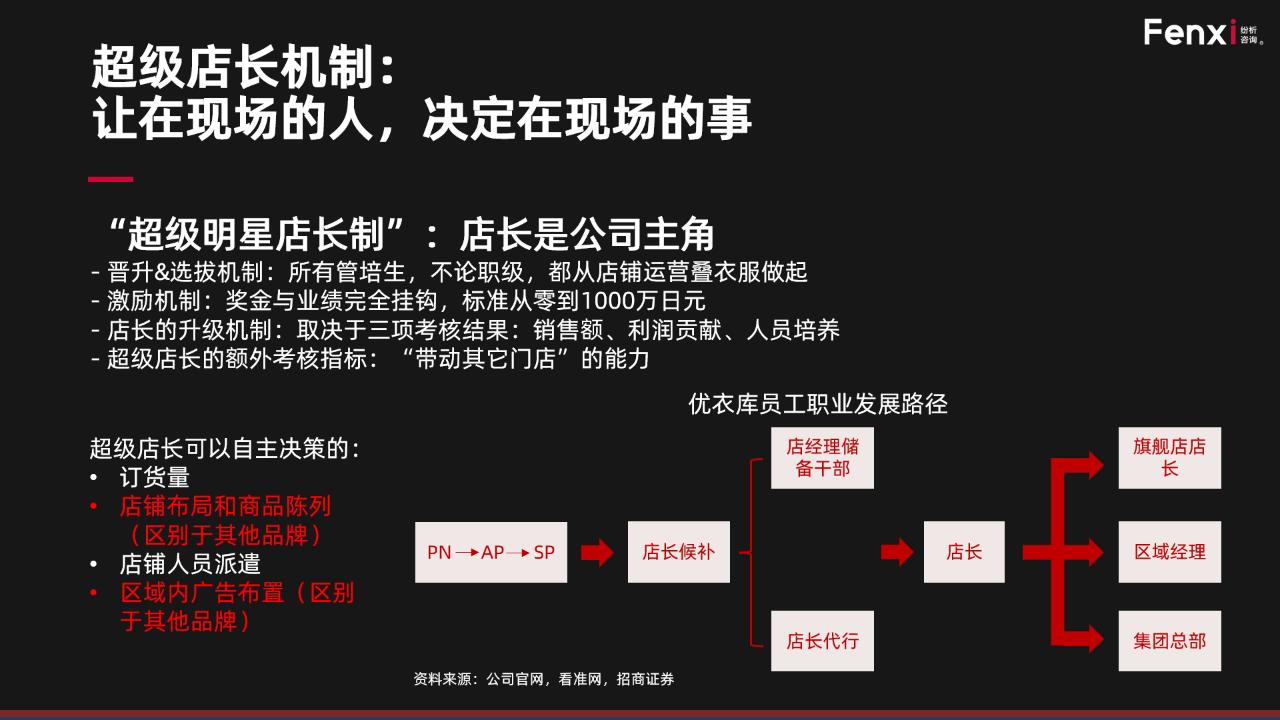 优衣库线下门店的销售效率是很高的,他的直营店铺坪效远超国内类似李宁、森马这样的品牌。这背后,是他们的超级店长机制。