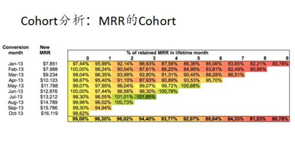 另一个时间角度,是用cohort分析,去看流量的更长时间的转化率或者流失率。Cohort分析通过对性质完全一样的可对比群体的留存情况的比较,来发现哪些因素影响短、中、长期的留存。最典型的Cohort Analysis 表格,一般第一列为自然月份排列,第二列为每个自然月的新增用户数,右侧的表格为当月新增的用户数在后续每个月的留存情况。cohort只用简单的一个图表,甚至连四则运算都不用,就直接描述了用户在一段时间周期(甚至是整个LTV)的留存(或流失)变化情况(如下图)。