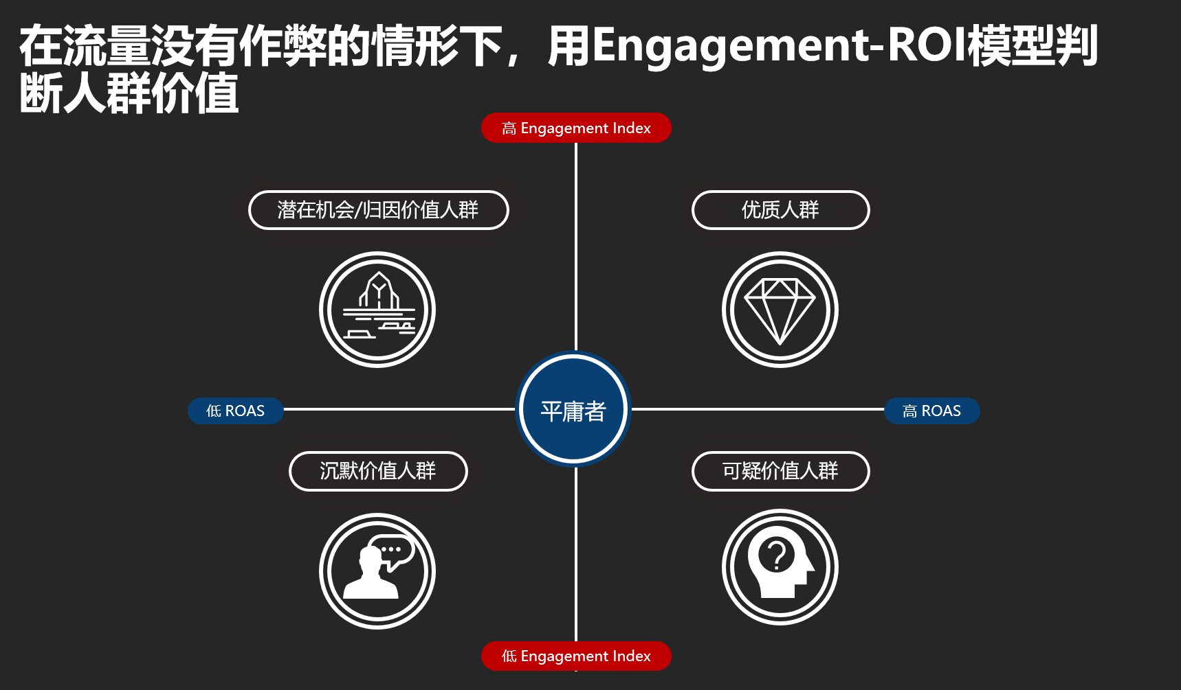 关于ROI,一个真实的例子,宝洁大中华区营销营销副总裁何亚彬曾公开表示,以前宝洁都致力于提升ROI,但是做了一段时间以后,发现ROI跟增长几乎没有关系。因为只要你压缩成本,ROI肯定会提高。所以,ROI不是一个单纯评价投放结果的手段。流量的目的很不同,流量的属性也很不同的,所以一定不能用一个单一的ROI来衡量。