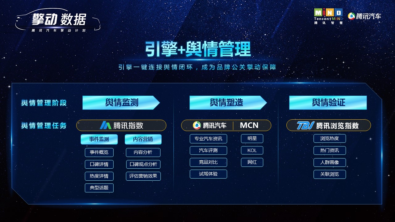 口碑和舆情则是腾讯的另外一个很有说服力的效果衡量武器,一方面,腾讯社交产品不似电商容易受到刷单和伪评价的侵袭,舆情和口碑的信息相对更为客观,完全不受到调研样本偏差或者问题诱导的影响。另一方面,从舆情管理的角度上,首先腾讯指数可以进行事件监测以及内容营销分析,对庞杂的信息进行梳理。其次,在对外发声时,腾讯新闻包括腾讯汽车以及合作的MCN机构都具备专业内容产出能力可用于舆情塑造。最后,腾讯浏览指数可以对传播效果进行分析验证,生成人群画像和浏览路径,数据沉淀将为营销策略带来进一步优化。