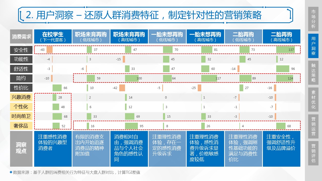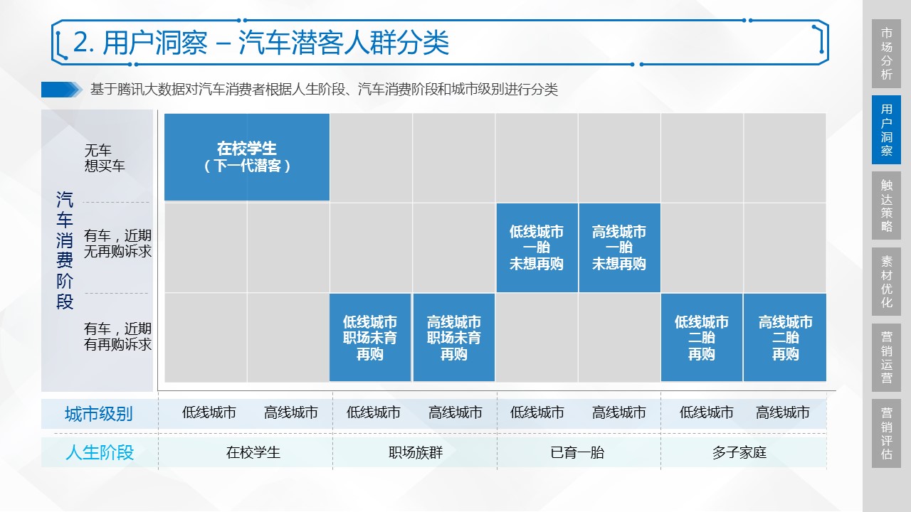 第一手安排,将消费场景等维度建立的数据模型,不仅用于受众定向,也用于受众洞察。例如,构建汽车消费意愿(图中的汽车消费阶段)和不同社会属性人群之间的多维交叉分析的特征洞察。