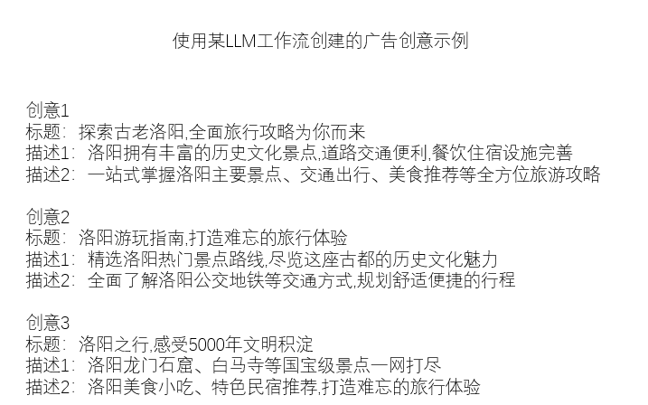 传统方法是运营人员对关键词进行分组,根据不同用户意图撰写3-5条文案模板,或者使用结构化数据和规则来进行组合,能一定程度上实现的精细化创意。引入LLM后,根据用户需求和对应的页面作为上下文撰写广告创意,能极大的提升用户需求、广告创意与落地页3者之间的匹配度和一致性,大幅提升广告点击率和用户体验,获得的流量份额、点击单价、用户到业务转化率均会被优化。