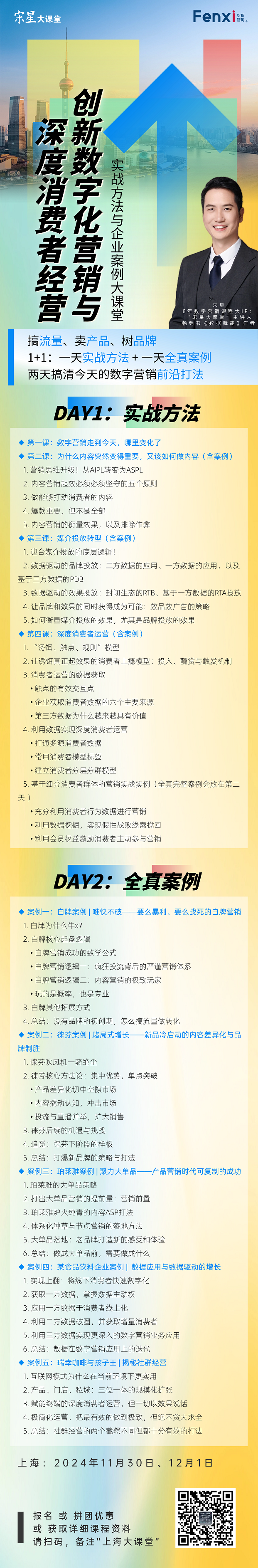 欢迎大家来我的大课堂听这些企业数字营销打法的所有策略细节与执行机要。时间2024年11月30日、12月1日(周六日两天),地点上海。