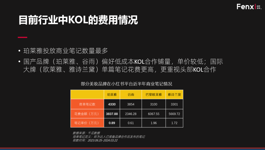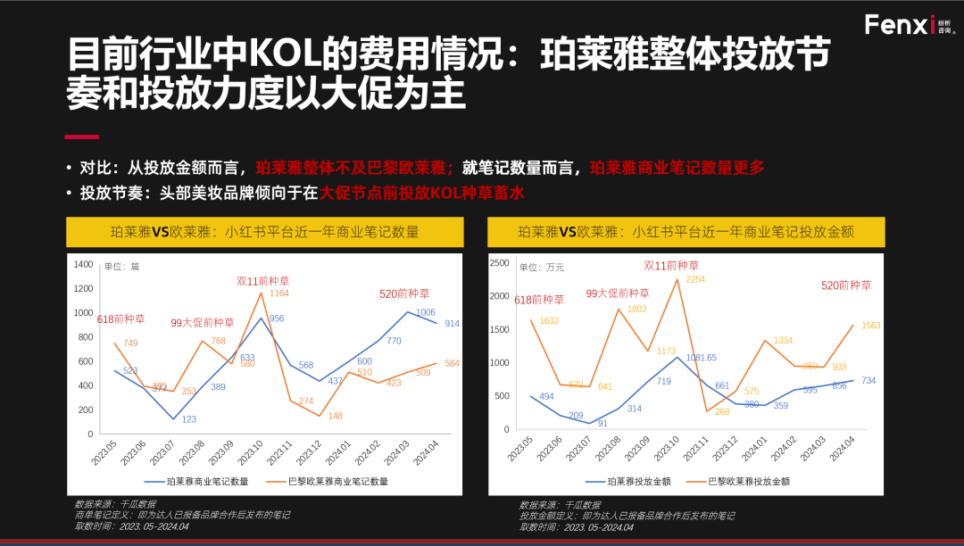 第二,珀莱雅的数字营销的思路,也是“花小钱”办大事的。当然,这里的小钱,看跟谁比,可能跟徕芬这样的新品牌比,珀莱雅的市场预算足够雄厚,但是跟欧莱雅比,珀莱雅的花费,还真是比不上。但珀莱雅的营销效果,跟欧莱雅相比,真得不遑多让。