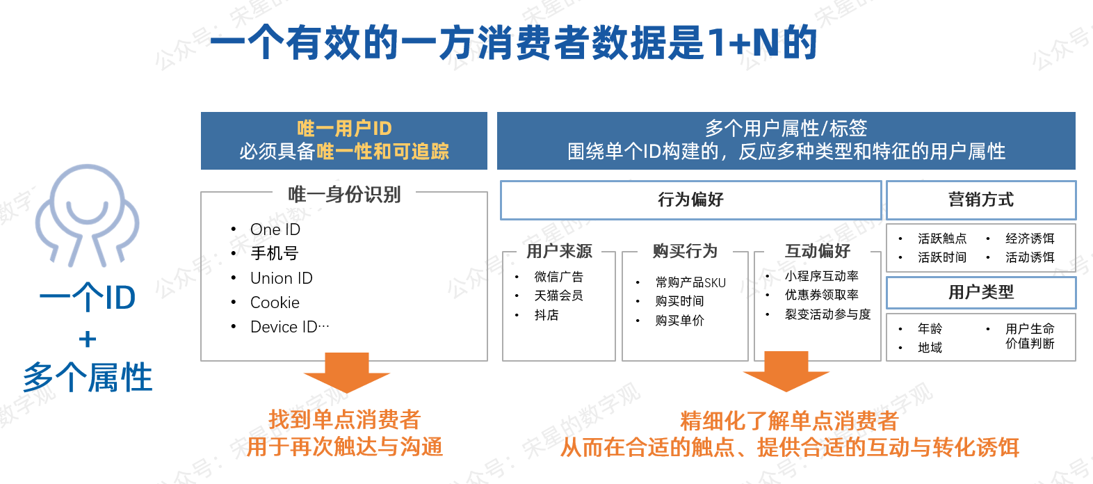 - 属性,或者说属性构成的标签,是围绕单个个体ID产生的。ID和属性就像是1和0的关系,缺乏了1(ID),后面再多属性都只是空谈;你只有1(ID)没有0,数据的价值只能停留在个位数。