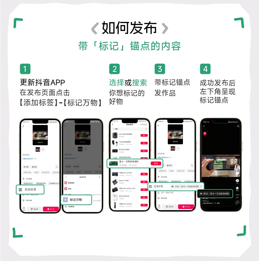 标记万物的实现方式也很简单:当创作者的有效粉丝数超过 500 时,在发布视频前搜索相关商品,添加标记即可。