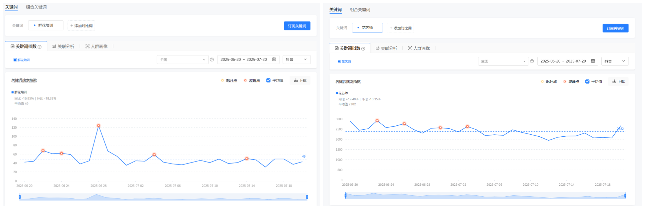 但如果本身就是冷门赛道,包括最核心的关键词本身流量都很少的话,可以向上进行扩词。如是做鲜花培训的行业,但关键词搜索指数很低,可以选择花艺师的相关词。