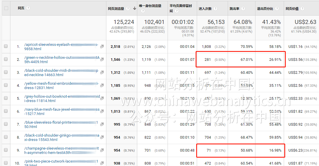 在下图中,这些商品中有部分商品的跳出率高,但退出率低。你能发现它们作为进入页面(或者称为入口页面,即entry的机会太少)。但是,它们本身的品质并不低,或许应该给与它们更多的外部流量。
