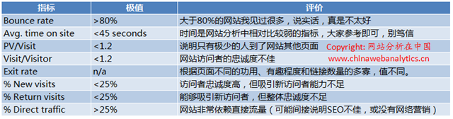 下面列举一些我经验中的一些极值(请注意,这些值只对用Google Analytics分析有效,其他WA工具因为定义和监测方式的不同,数值可能有明显区别),如果超过这些值,可能说明网站出现了较为严重的问题(但不绝对!)