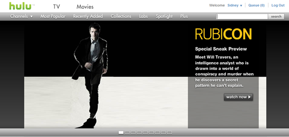 所谓页面动态事件,即我们常说的页面上的非HTML链接的交互式元素,包括flash/flex中的按钮或链接、JavaScript、AJAX、SilverLight、HTML5中的动态事件等,例如下图中hulu的滚动图中的“watch now>”就是一个flash按钮。用户访问这些动态事件的行为,不能够直接通过标准代码获得监测数据,因此需要对监测代码做一定的定制。