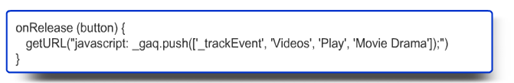 为了弥补这个缺陷,Google Analytics开发了另一种更先进的功能,就是已经不再神秘的event tracking功能,语法是: “_gaq.push(['_trackEvent','category','action','lable',value]);”,同样是添加到onclick(或是onrelease)事件中,跟virtual page的添加方法非常类似。