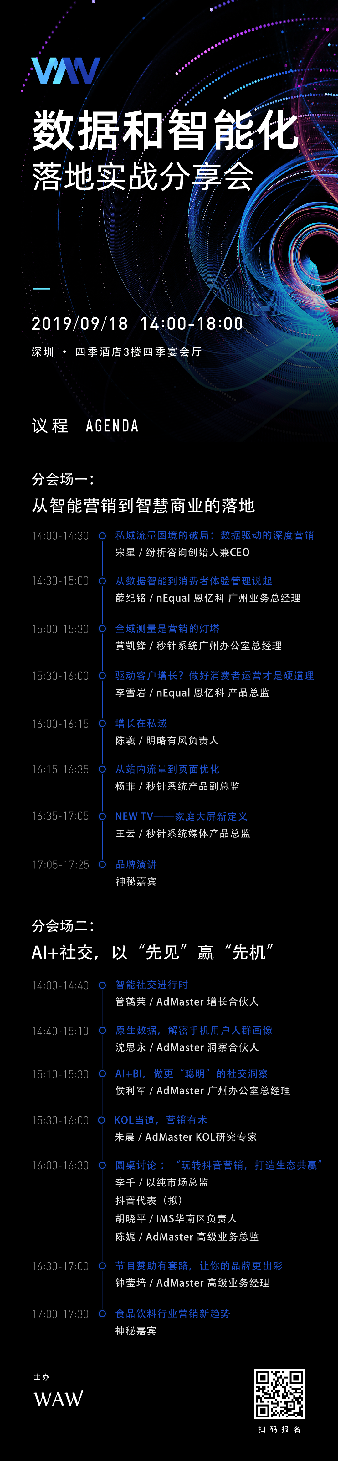 9月18日,WAW第68站,也是2019年深圳首站,我们就智能营销到智慧商业的落地、AI+社交,以“先见”赢“先机”两方面与各位行业人士盘点更多的优秀案例、拆解更多可复制的方法论,共同探讨未来营销之道!
