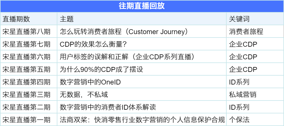 我们会准备10期的对话内容给大家。这10期内容,除了两期对话宋星老师这位超级大咖,我们还找了8位在行业中平均工作10年以上对数据应用有深度见解的营销数据达人,他们都是从扎实的一线实操开始一步步做到带领自己的团队帮助企业达成营销业绩,包括从广告投放到消费者运营、会员营销到CRM运营、CDP/MA系统应用等等。