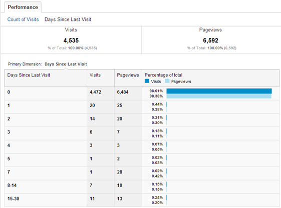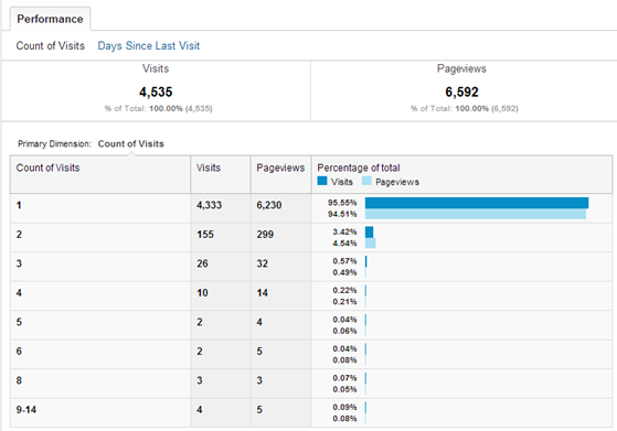 如果不做额外的设置,这种安排意味着两点,第一,网站分析工具统计到的网站浏览时间总是小于网站被打开在浏览器中的时间(尽管浏览器打开页面未必意味着你真的每分每秒都在看它);第二,所有bounce掉的visit(即只访问了一个页面的visit)在网站上的停留时间计为0。