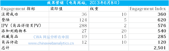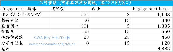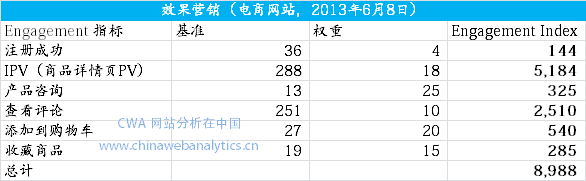 有了权重,按照各个不同的行为的实际值,计算出各指标的Engagement Index完全轻而易举。如下表所示: