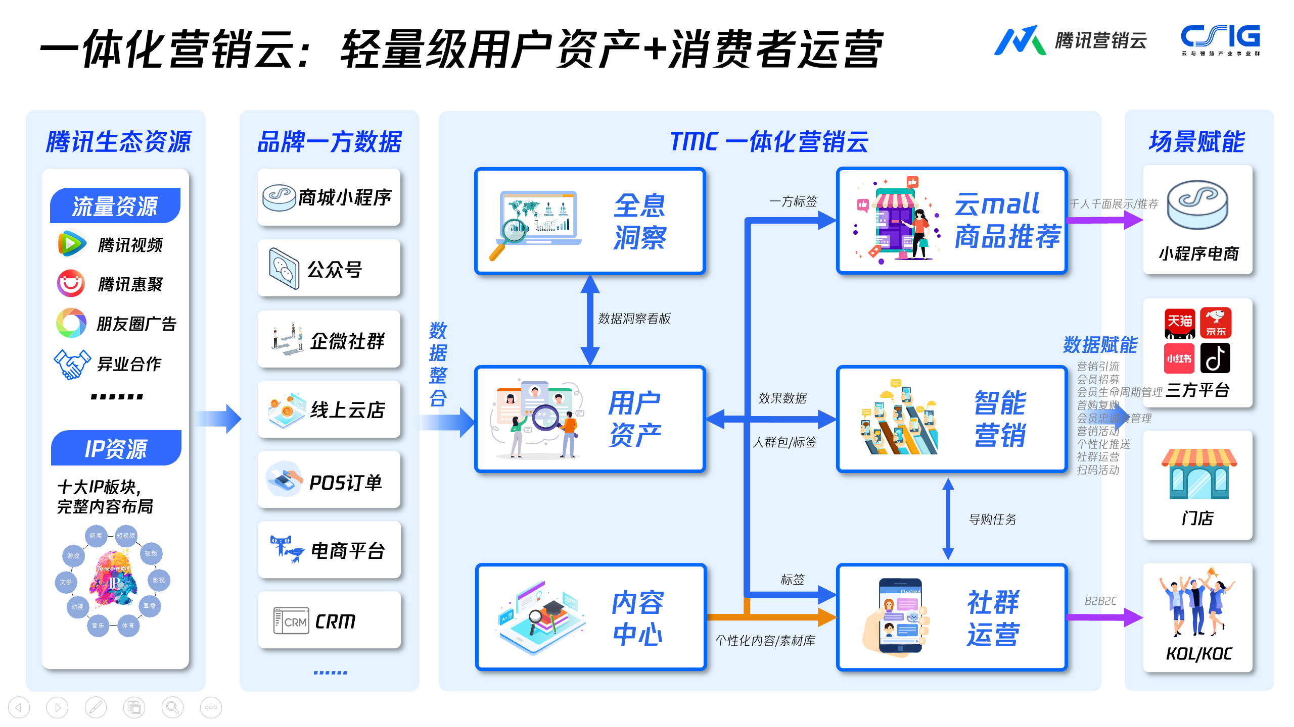 TMC营销云帮助李宁在整合品牌第一方数据的同时,依靠腾讯数据能力优化用户群体的分析洞察结论;对接各营销(含广告投放)和运营工具,为这些工具的应用提供数据“血液”和智能化的指导。另外,TMC还实时获取营销和运营过程中的数据,并为不同的营销策略提供AB测试的功能。是李宁私域的营销和数据的中枢。
