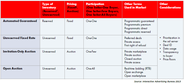 在国际广告局(IAB)的介绍程序化广告的标准文档中,我们会看到上面所说的四种方式,如下表所示。我就不翻译了,大家自己看。IAB用的名字跟中国人喜欢用的名字(虽然都是英语)有所不同,不过我相信这对你不是问题,你肯定能够很轻松地对号入座。读懂了我上面的文字,下表也就不是问题了。甚至,当我们国家的互联网公司再推出让你莫名其妙的广告产品的时候,你也会立即恍然大悟,原来是这个意思!