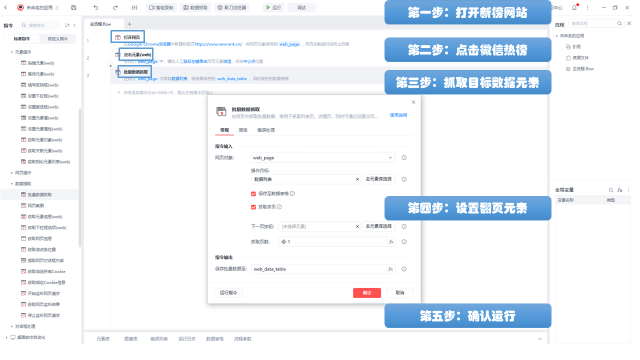打开RPA软件根据操作步骤:打开新榜网站-点击微信热榜-复制数据-切换日期-复制数据,通过拖拽形式完成流程设置,点击运营即可实现数据的自动获取并保存在excel上。
