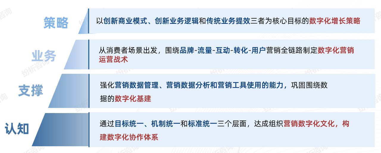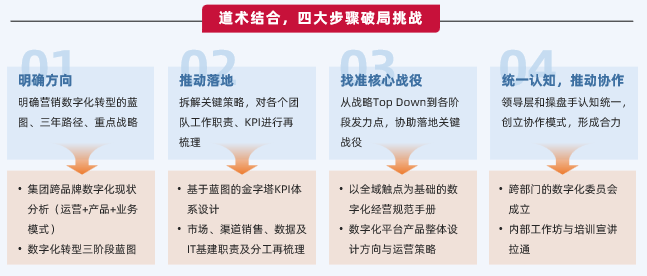 - 核心难点:营销数字化转型初期面临由于数字化愿景的模糊导致多方协作不通畅,转型落地无处发力的尴尬局面。