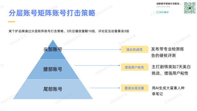在原本账号上统一分发上,进行分层升级。不同层级的账号,定位的功能不同。头部账号强化权威性,腰部账号增加用户粘性,尾部账号覆盖长尾流量。