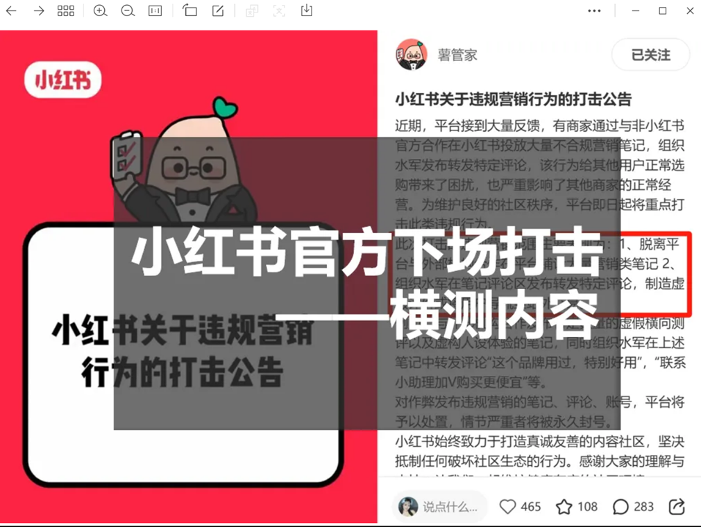 和内容的生命周期一样,每一种玩法也存在红利期。用户、商家和平台三方处于实时博弈的状态。从2025年4月开始,小红书官方下场打击横测内容,这意味着单一笔记类型、单一渠道、大量免费垃圾内容铺设的窗口期正在关闭。