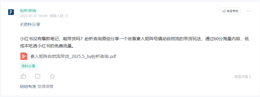 完整文档《素人矩阵自然流带货_2025.5_by纷析咨询》,已更新在知识星球中。加入知识星球即可下载:
