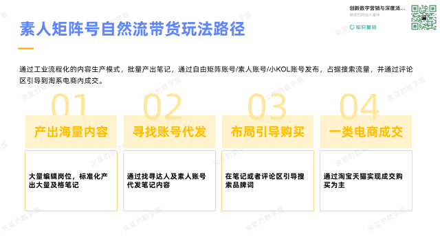 素人矩阵号自然流带货玩法的底层策略,是通过工业流程化的内容生产模式,批量产出笔记,再通过自由矩阵账号/素人账号/小KOL账号发布,占据搜索流量,并通过评论区引导到淘系电商内成交。